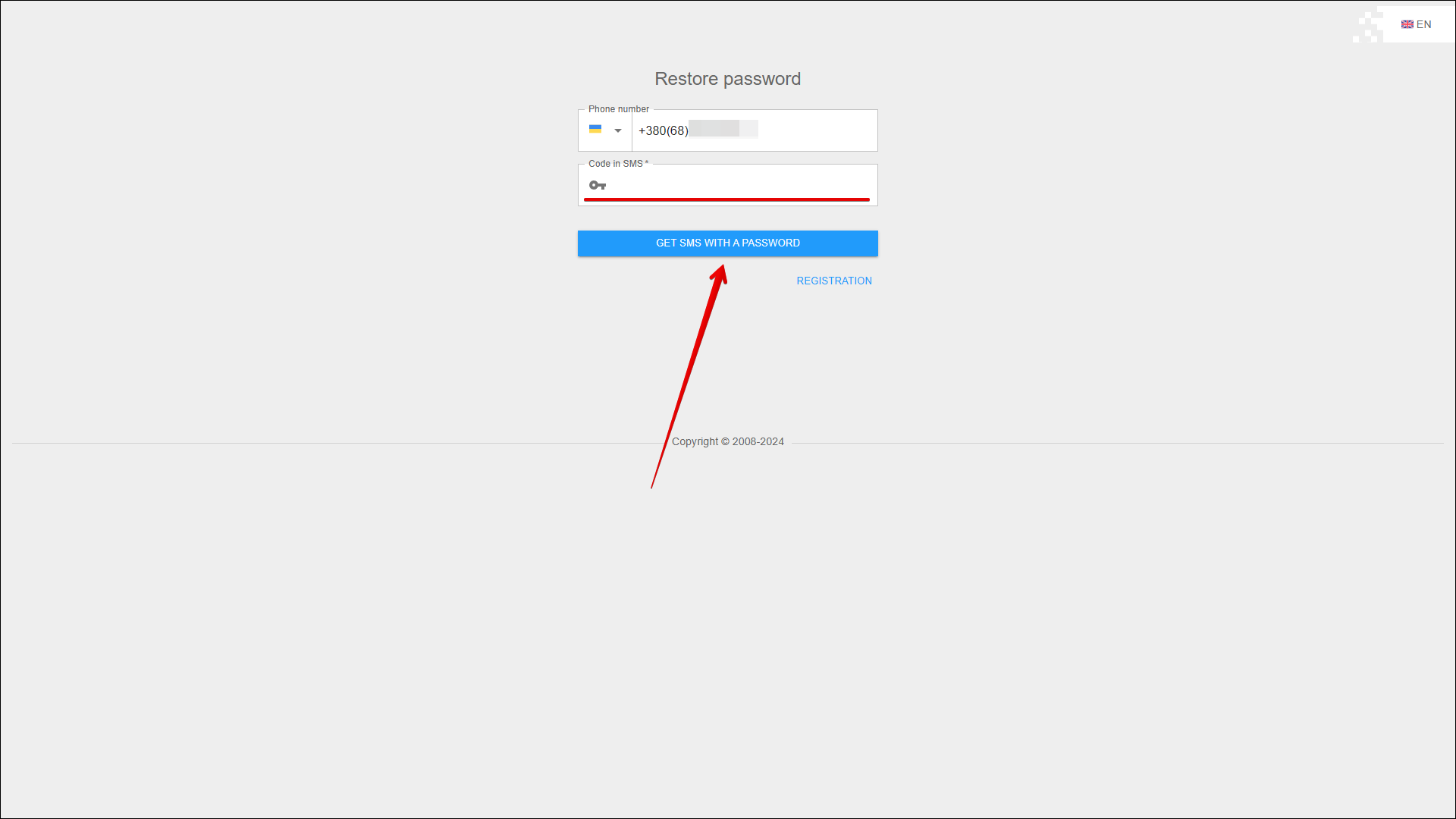 On the entered phone number you will receive an SMS with a code, which should be entered in the Code in SMS field, and then press the GET SMS WITH A PASSWORD button.